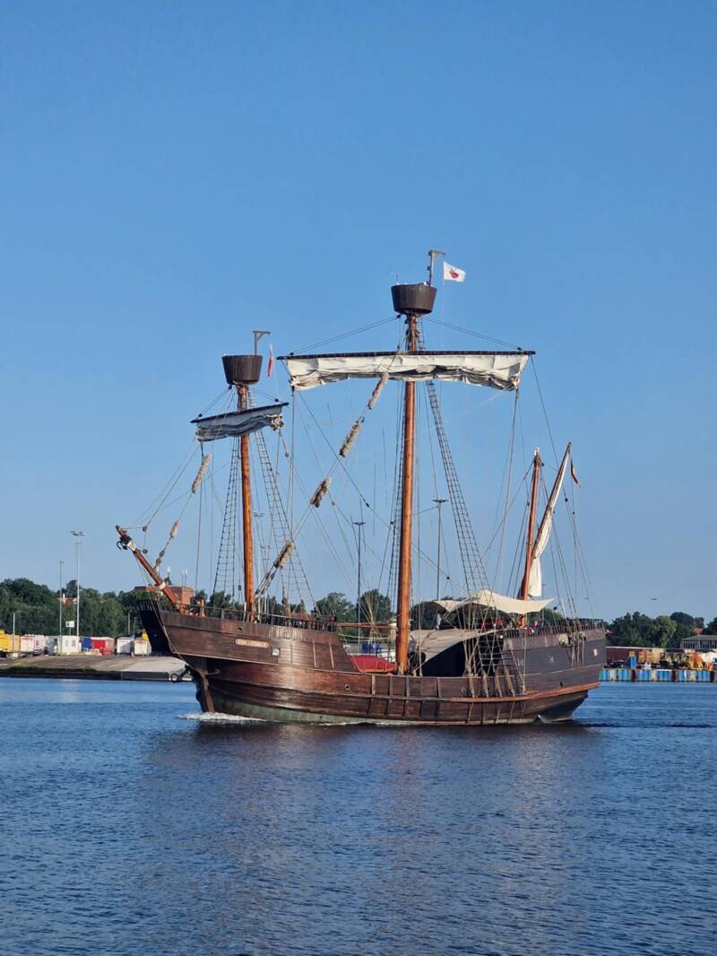 Vi sejler ud af Lübeck og er nu på Trave . Det er en smuk morgen .