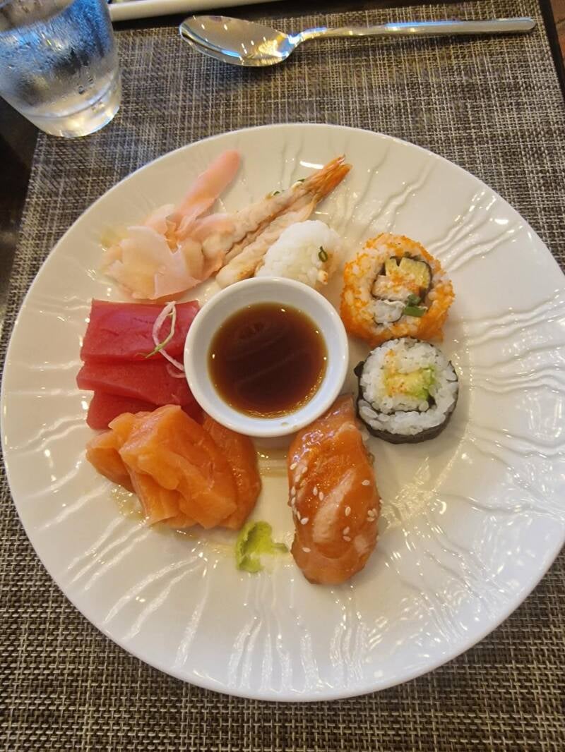 Vi startede med at smage lidt sushi . Her var udvalget meget begrænset , men det der var , smagte lækkert .