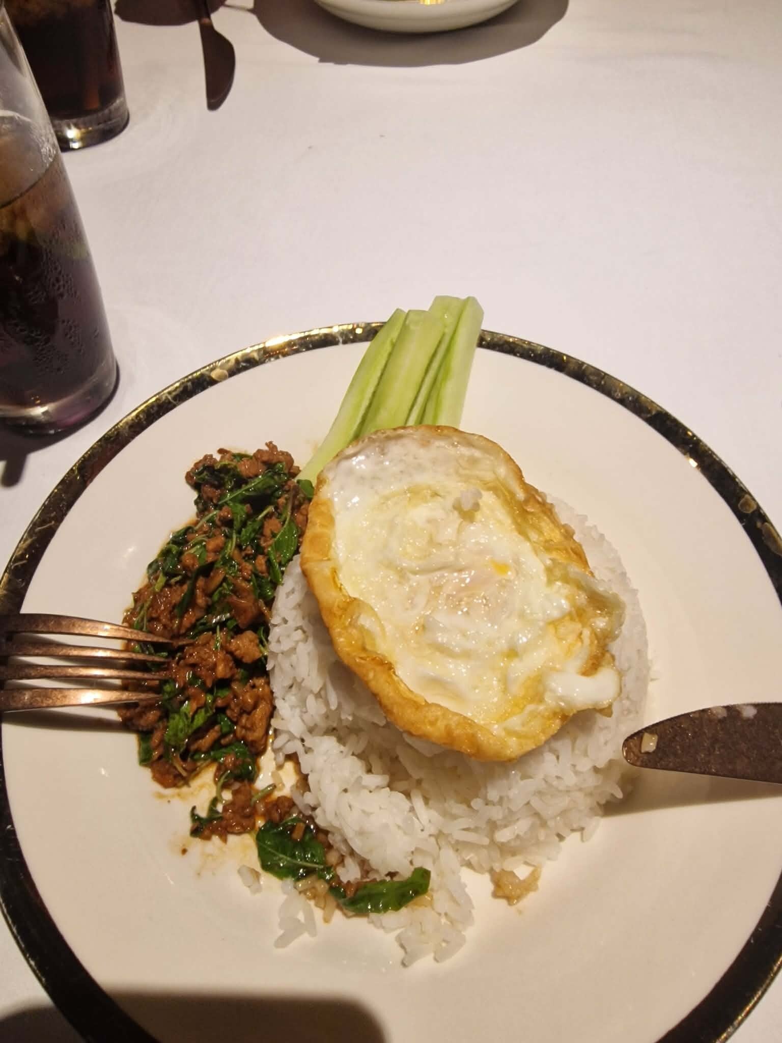 Pad krapow . I en not spicy udgave , hvilket vi selv valgte . Der er normalt en del chilli i .
