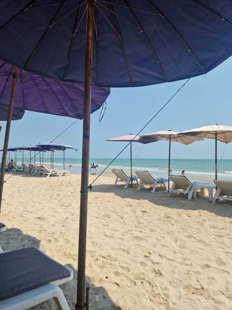 Her kom vi til et sted med næsten øde strand og en masse overdækkede borde og stole . Her tog vi en drikkepause .