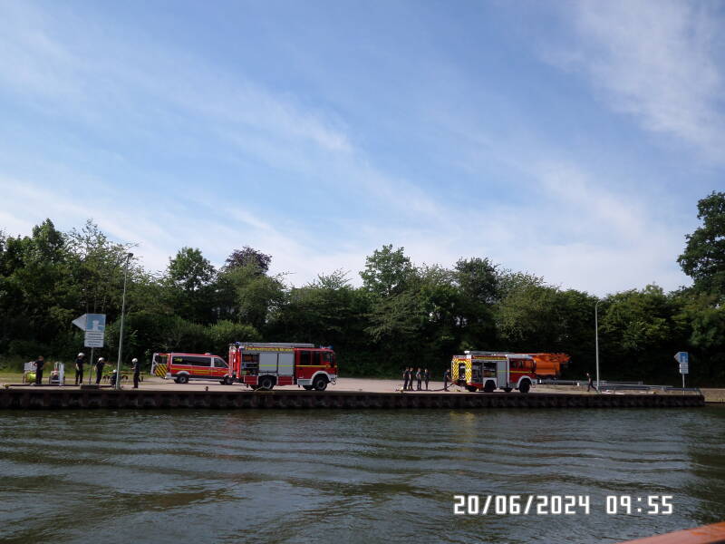 Vi er klar til at sejle fra Minden kl. 9.40 . Lige uden for Minden er der gang i noget undervisning / afprøvning af brandslukningspumper . og der er også en dejlig lille havn på modsatte side af kanalen , som vi ikke kan erindre at have set før .