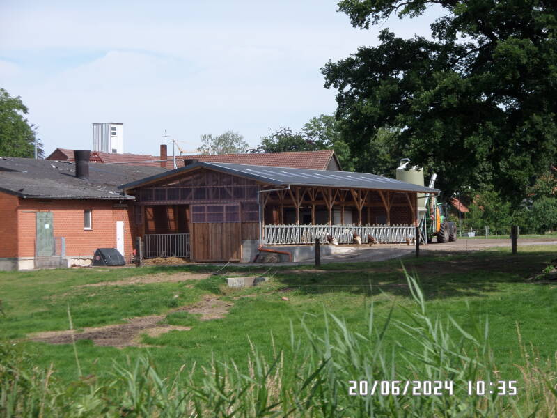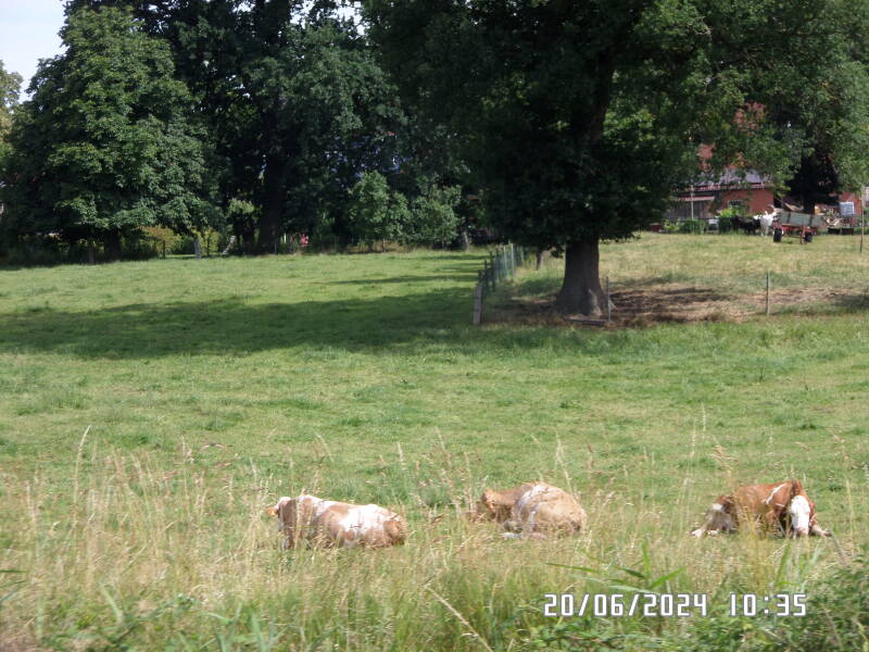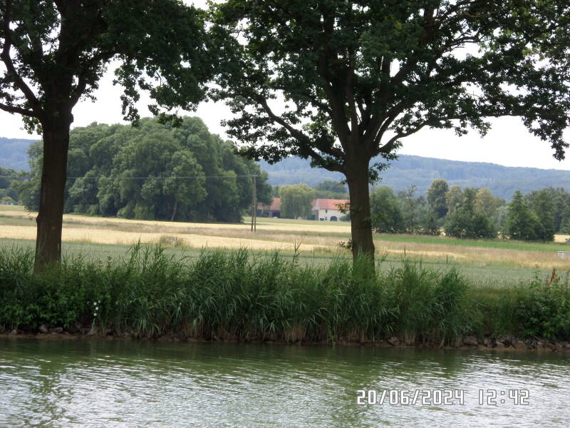 Inde på den ene side af kanalen , ligger der køer og tygger drøv og der er en meget flot stald . ( jeg tror at det var heste der gik der , da vi sejlede forbi for 5 år siden , jeg syntes at det ligner det samme sted .