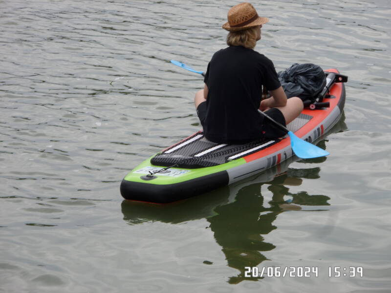 Da vi har fortøjret og siddet noget tid , ser jeg i øjenkrogen en stråhat og tænker i første omgang , hvad pokker er det . Det er så en på et paddleboard , der tager det meget stille og roligt . Han ender med at padle ind i havnen , skråt overfor liggepladsen .