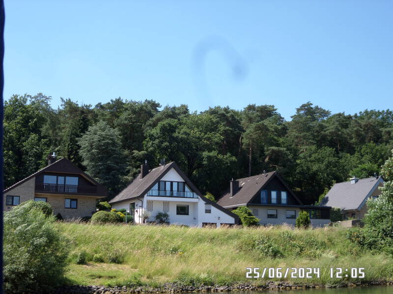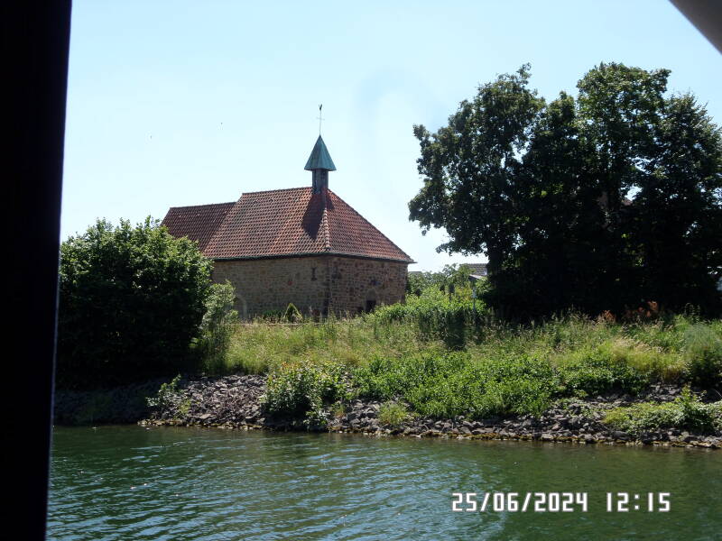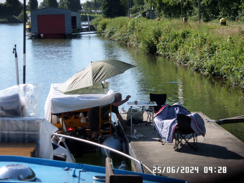 Vi sejler et par hundrede meter hen om hjørnet , hvor vi skal i slusen ned på Wesel - Datteln kanalen og da jeg kalder slusen får vi at vi skal festmachen und warten . Der hvor vi lægger os er ikke det rigtige ventested , men et sted man må ligge i 72 timer og det ser ud til at der er 1 der bor der i sin lille båd .