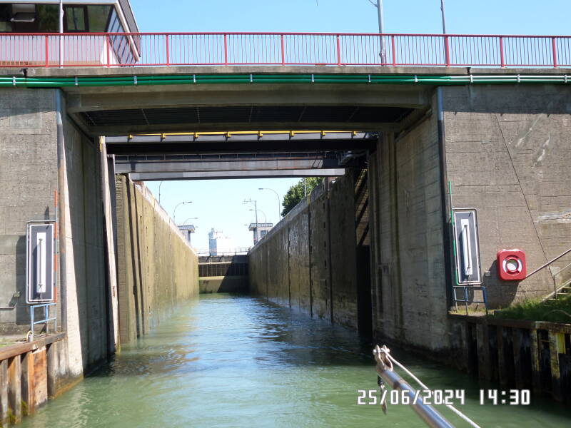Så mangler vi bare dagens 4`de og sidste sluse , her er det 9 meter ned . ( I alt er vi sluset 28 meter ned i dag ) .I de tre første , blev vi sluset alene , men her måtte vi nøjes med at følge en lægter og da vi sejlede ind var det svært på grund af lægterens skruestrøm . Jeg kunne høre at slusepersonalet gennem VHF radioen sagde at han skulle slukke motoren på grund af sportsbooten .