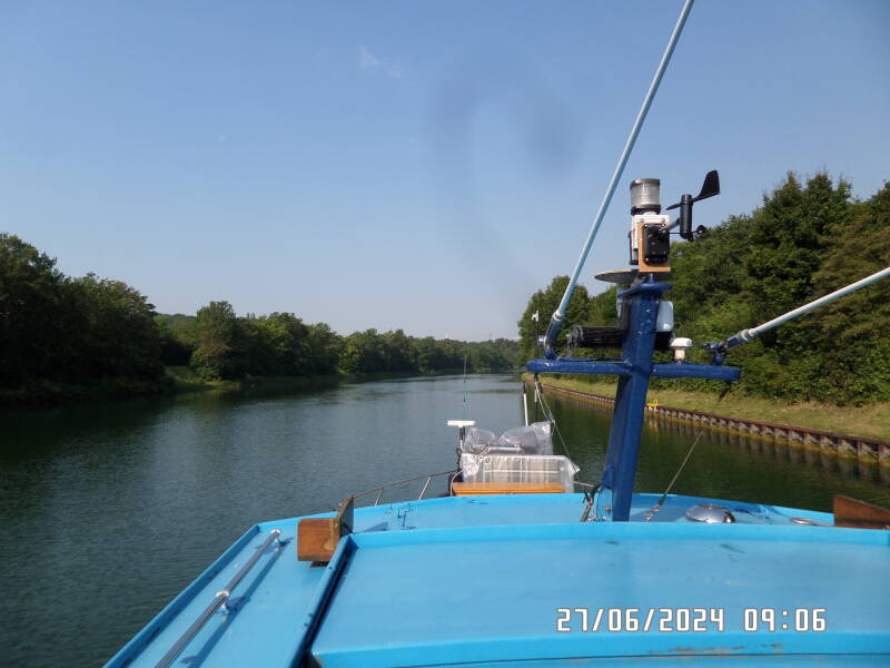 I dag tog vi så afsted kl. 8.45 og vi sejlede forbi et sted , hvor vi kunne have tanket diesel , men der lå flere både i vejen , så vi sejlede videre . Der er knap 20 km til den første sluse . Det bliver også en rigtig varm dag i dag .