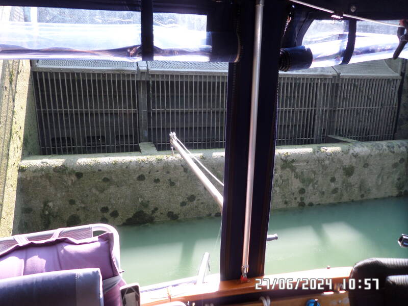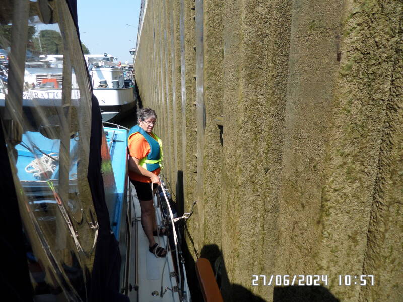 Vi når slusen og kalder og vi får at vide at vi skal vente . Vi venter ikke ret længe , så kommer der en Hollandsk lægter , som vi får at vide , vi kan sejle efter i slusen . Det bliver helt dagens positive oplevelse , for da vi sejler ind , er lægteren og lægteskipperen , kommer hen og hjælper os med at lægge ind og han er meget snaksalig . Han fortæller at han også har båd og har sejlet fra Norge , gennem Danmark . Han siger til sidst , før han går tilbage for at passe sit skib at han nok skal starte stille op , når han går ud . Og det gjorde han bestemt også .