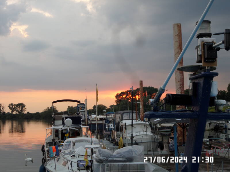 Vi kommer på Rhinen og blæser afsted . Fra at have sejlet 5,7 knob er vi oppe på 9,5 knob , så det går stærkt , så vi er hurtigt ved Yachthafen Wesel , som ligger i en flodarm og her ligger vores svenske og hollandske følgesvende . Vi lægger til kl. 15.45 .