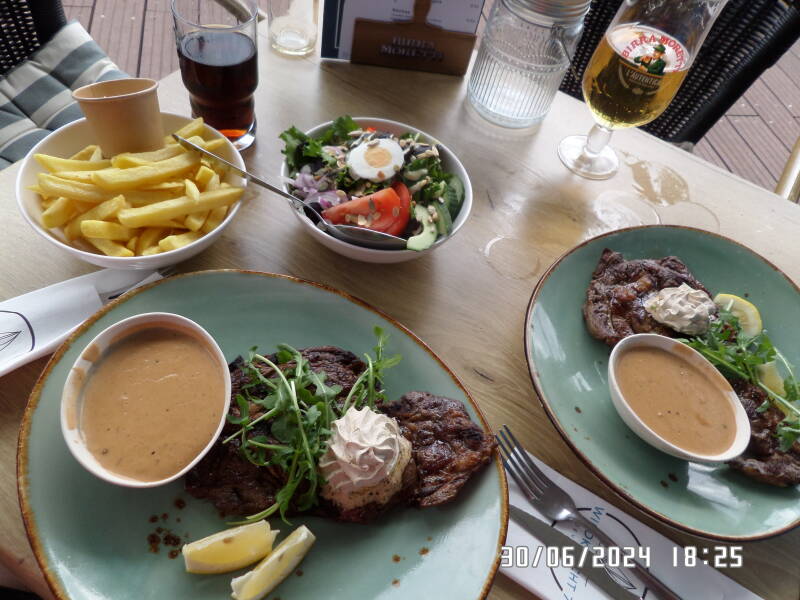 Vi spiste rumpsteak med kryddersmør , pebersovs , salat og pommes . Det var rigtigt lækkert .
