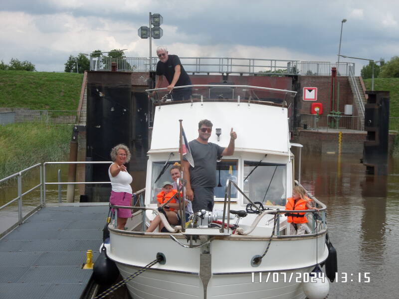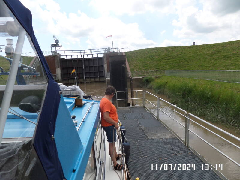 Da vi er ca. 1 km. fra slusen i Papenburg , ringer jeg og fortæller at vi kommer 2 både , der gerne vil ind til Papenburg . Her får jeg så at vide , at vi kan blive sluset 15.30 , men vi kan lægge os ved ventepladsen . Det vælger vi så ikke at gøre , da der er under 10 minutter til , så vi bliver liggende ude i forhavnen . På slaget 15.30 begynder sluseporten at glide til side og 2 sportsbåde sejler ud , hvorefter vi sejler ind . Slusen er enormt bred og lang , så der er rigeligt plads til 2 både . Vi blev sluset omkring 1 m ned .