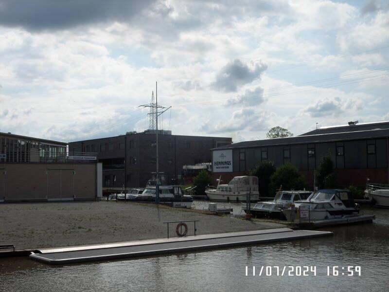 Nå men vi kom så igennem broerne og lige til højre efter ligger havnen , hvor der på den anden side af bassinet er et Linsen værft / forhandler . Her er plads , hvor vi igen kan ligge langskibs . Klokken er blevet 16.35 .