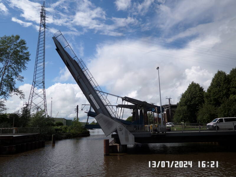 Vi drejer ind af Kustenkanalen og overhaler den lægter , som vi blev sluset med og når frem til en sluse , der i App og kortoplysninger skulle stå åben for gennemsejling , men det gjorde den ikke . Vi når næsten hen til slusen , da lyset bliver grønt . Bedst som vi troede at vi bare kunne sejle ind , bliver vi fortalt over en højtaler , at der var et berufsschif der skulle ind først og at den ville komme tom tilbage til os , så vi skulle lægge os ved ventestedet . Det gjorde vi og kort tid efter blev det vores tur . Vi kom igennem slusen bare Flora og os .
