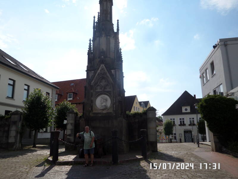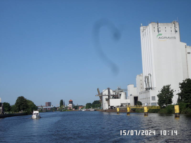 I dag var vi blevet enige med FLORA´s besætning , at vi skulle afsted kl. 9 , så derfor var Ken og jeg oppe kl. 7 . Vi ville afsted inden der kom for meget trafik på kanalen . Jeg havde godt nok læst , at der ikke sejlede mere end 3 skibe igennem kanalen om dagen i gennemsnit , men nu er det jo mandag , så man ved jo aldrig . Vi sejler de få km. ned til slusen , vi var nede ved i går og kalder slusen . Den ville komme tom op til os . Der lå en sportsbåd og ventede ,( den var sejlet forbi tidligere , inde vi lagde fra ) Vi kom ret hurtigt i slusen og blev sluset ca. 3 meter ned på Untere Hunte . Vi sejler en tur ind i Stadthaven Oldenburg , for at se om de skulle have et tankanlæg , men nej intet at komme efter . Vi sejler ud af Oldenborg med retning mod Elsfleth .