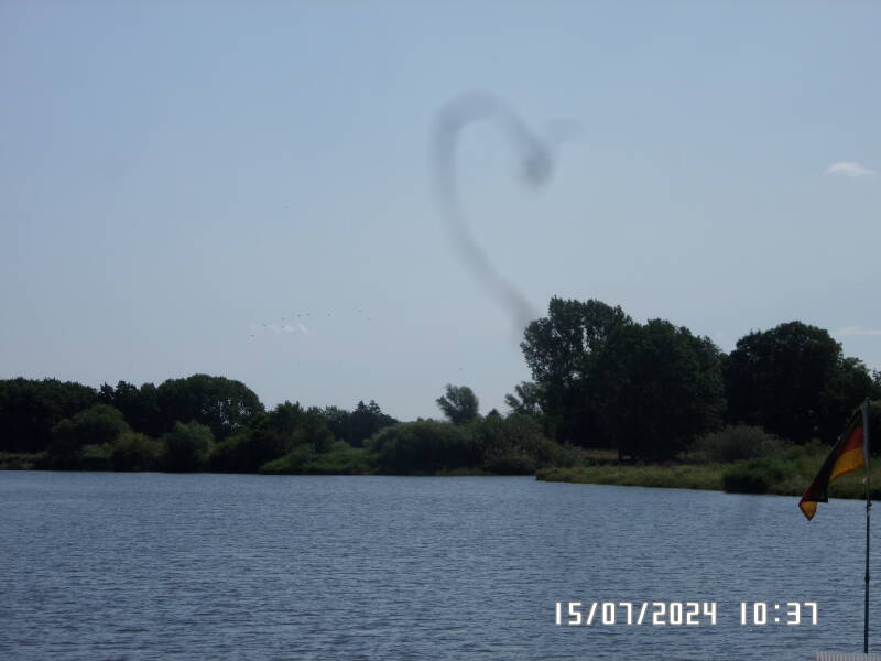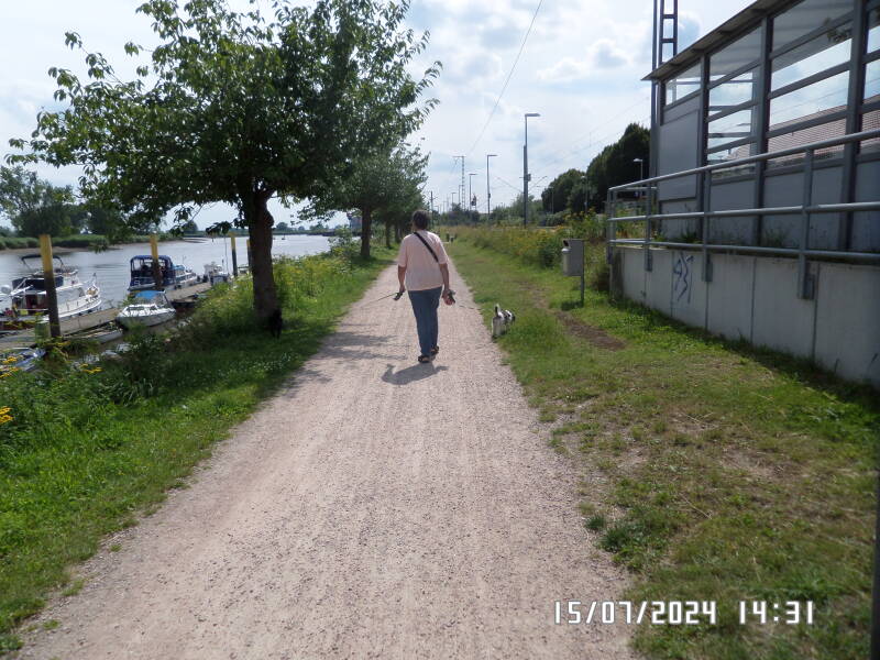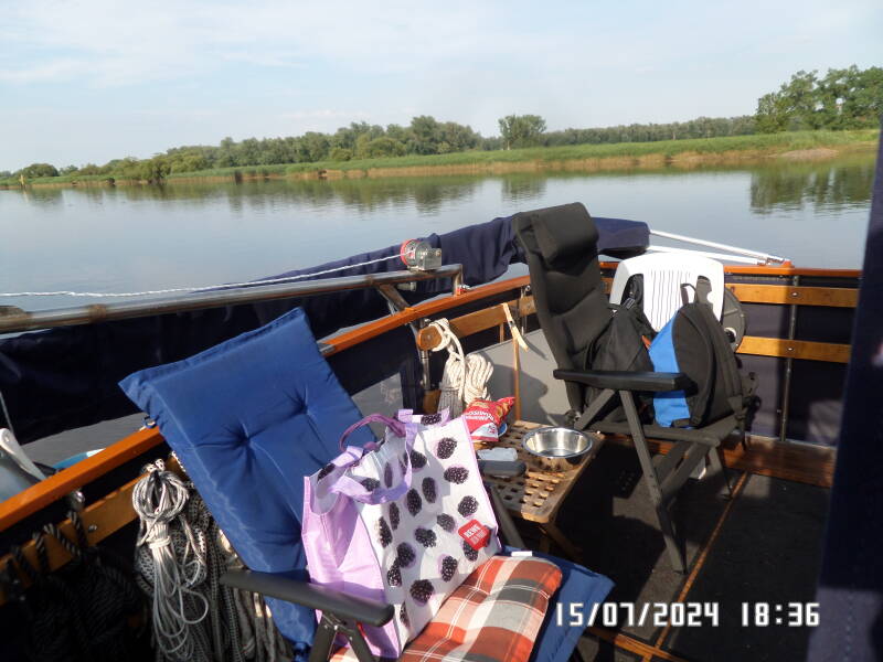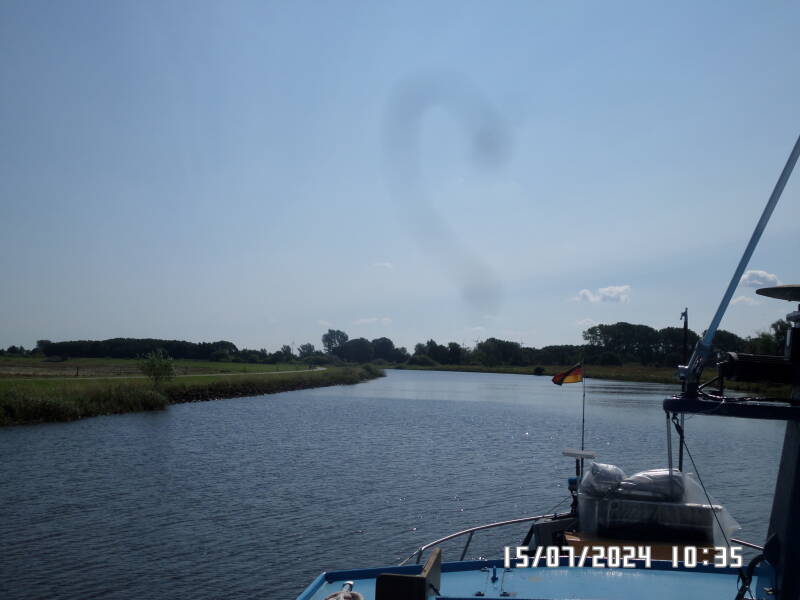 Det er meget smukkere at sejle på Untere Hunte og selv om jeg ikke fik tjekket tidevand i går for dagens sejlads , har vi ramt det helt rigtige tidspunkt , nemlig at sejle hvor det lige har vendt fra flod til ebbe , således at vi får den udadgående strøm med os , så vi logger nogle knob mere . Vi sejler omkring 24 km på Untere Hunte og undervejs .