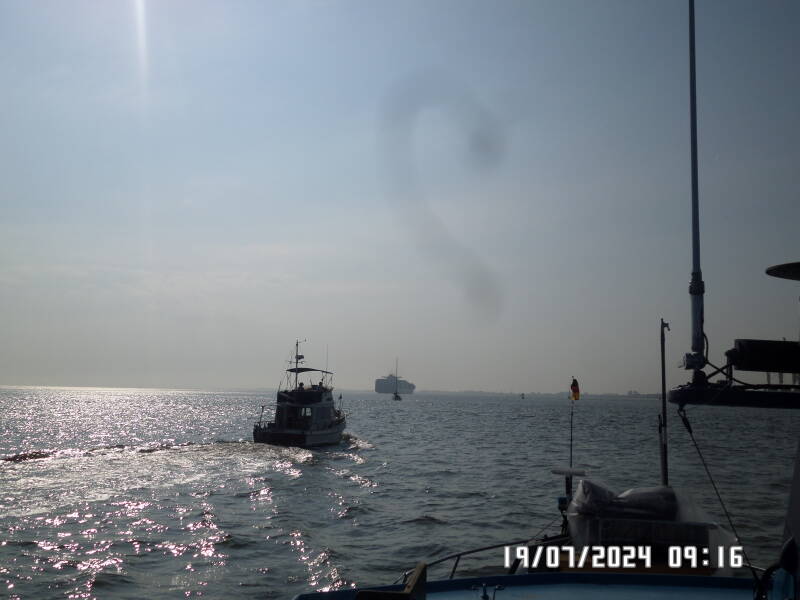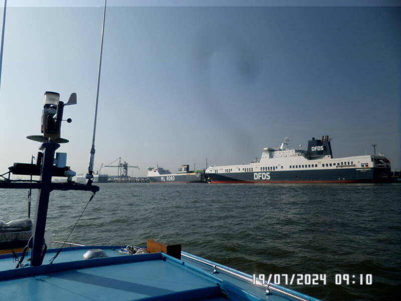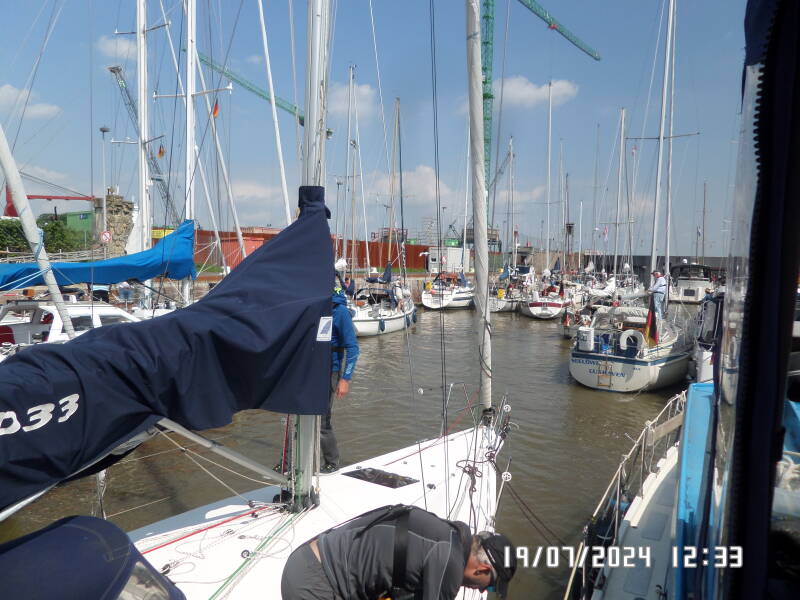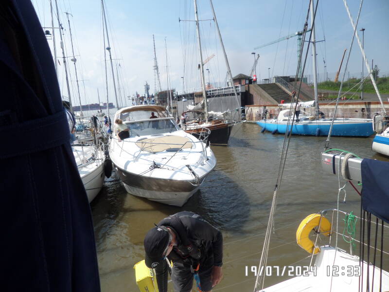Da vi kommer til Brunsbuttel , ligger der rigtigt mange sportsbåde allerede i forhavnen , men jeg kalder slusen , hvor jeg får at vide , at vi også skal ligge og vente på ventepladsen for sportsbåde og have VHF på kanal 13 tændt . Ventepladsen her , er bare et indhak i floden før slusen , hvor man bare må ligge og holde båden , nogenlunde stille , hvilket ikke er nemt , på grund af strøm og bølger fra forbipasserende både , pilotbåde og skibe .
