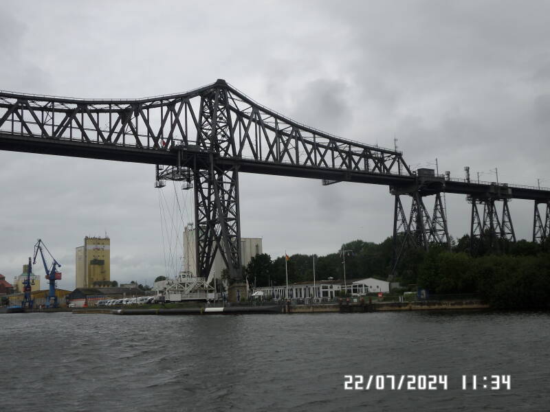 Her før vejen ned til Rendsburg , er der en svævefærge under en jernbanebro . Vi har aldrig før set den i drift , men det er fascinerende at se en sådan i drift . Den transporterer også biler over kanalen , ud over fodgængere og cyklister .