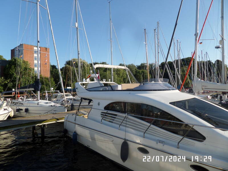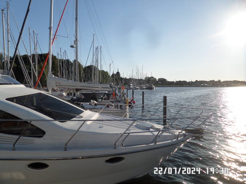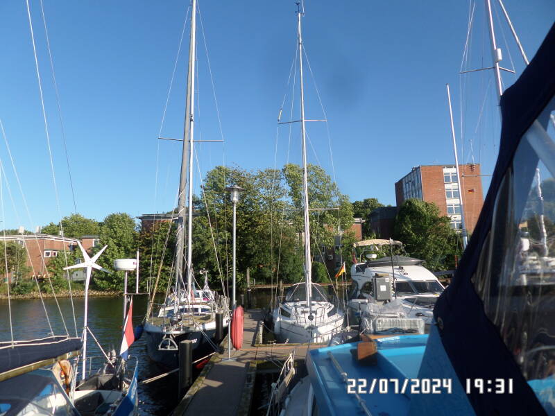 Vi sejler ind til en bro , hvor der står GÆSTER på , og lægger os lige ind på den første ledige plads , bag yderbroen , hvilket gør at vi egentligt ligger langskibs og ikke på pæle . Super , det kan vi godt lide . Vi kommer til at ligge ved siden af 2 andre danskere , i henholdsvis en sejlbåd og en stor motorbåd . Ham i motorbåden , kommer hen og snakker . De vil lægge fra og sejle til Brunsbuttel , hvilket vi fraråder på dette tidspunkt , da det vil være umuligt for ham at finde en plads i havnen , på dette tidspunkt af dagen og han ville risikere at skulle ligge udenpå som anden eller tredje båd . Han skulle lige konferere med sin kone . Det blev til at de så ville tage tidligt afsted i morgen i stedet . Vi talte lidt om hvor de så skulle hen , de skulle ud på Elben , mod Hamburg og ville ind i Gluckstadt , og han talte om et spærreværk , som kun var åbent en begrænset tid og det ville de se om de kunne nå . Jeg tjekkede min bog og fandt ud af , at det var slusen ind til Gluckstadt , han talte om . Jeg fortalte at , hvis man ikke lige er der når den åbner , er der en flydebro udenfor slusen , man kan ligge ved , indtil man kan komme ind .