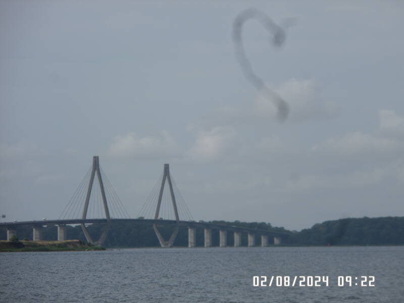Vi kan ikke ligge på vores plads , da den jo er blevet for smal , efter de rammede pæle ned i enderne af flydebroerne , så vi lægger os langskibs på katamaranens plads . Vi havde mødt den på vejen , nede ved Bøgestrømmen , men var der i tvivl om det var den og det var det så heldigvis .
