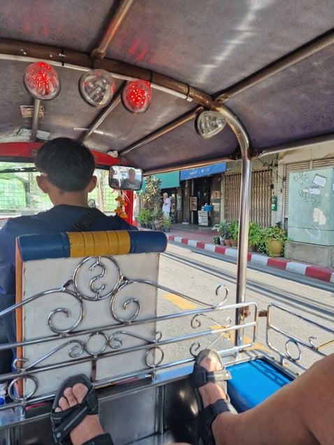 De tuktuk'er der kører her , er ikke helt som dem vi ellers har prøvet at køre med , de er sværere at komme ind og ud af , ihvertfald når man er europæer med lange ben , men det skulle prøves . Man sidder også bedre i disse , da man sidder med ansigtet i kørselsretningen og ikke sidelængs som i de andre . Fordelen er at de bedre kan sno sig gennem trafikken , end i en bil når den er tæt , og det var den .