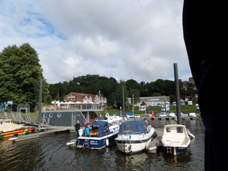 Ca. 11km længere fremme ligger Lauenburg sluse og her bliver vi også sluset alene . kl. ca. 10.30 er vi i Marina Lauenburg , som bare bliver hyggeligere fra år til år .