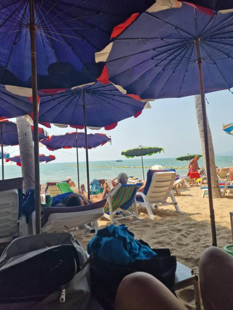 Vi gik på stranden og sad der i nogle timer , under en skov af parasoller og i dag blæste det en del , så mens vi sad der føltes det ikke så varmt . Temperaturen var minimum 30 grader men det føltes vel som omkring 25 grader . I dag er der også pæne bølger , i forhold til hvad der ellers har været .