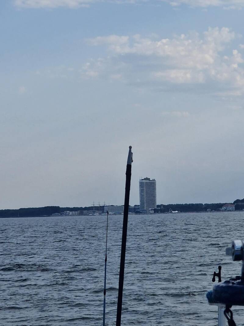 Vi nærmer os Travemunde og kan godt se at det trækker op til uvejr ude mod vest .