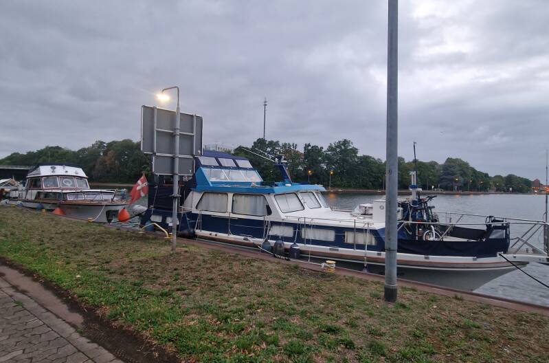Så nu er vi tilbage ved liggestedet I Minden , med udsigt til Weserslusen . Vi var utroligt heldige . Eftersom vi kom så sent , havde vi ikke troet at der var flere pladser , men der var lige en til os , foran 3 andre både .