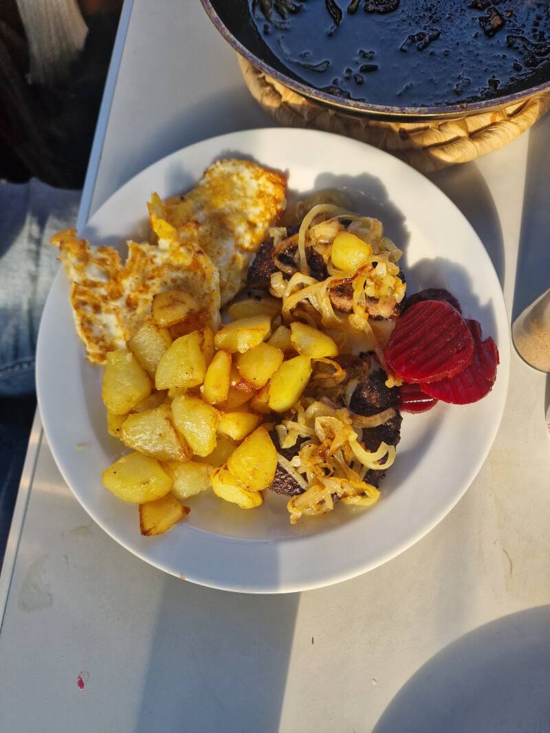 Bøf med løg , spejlæg , råstegte kartofler og rødbeder .