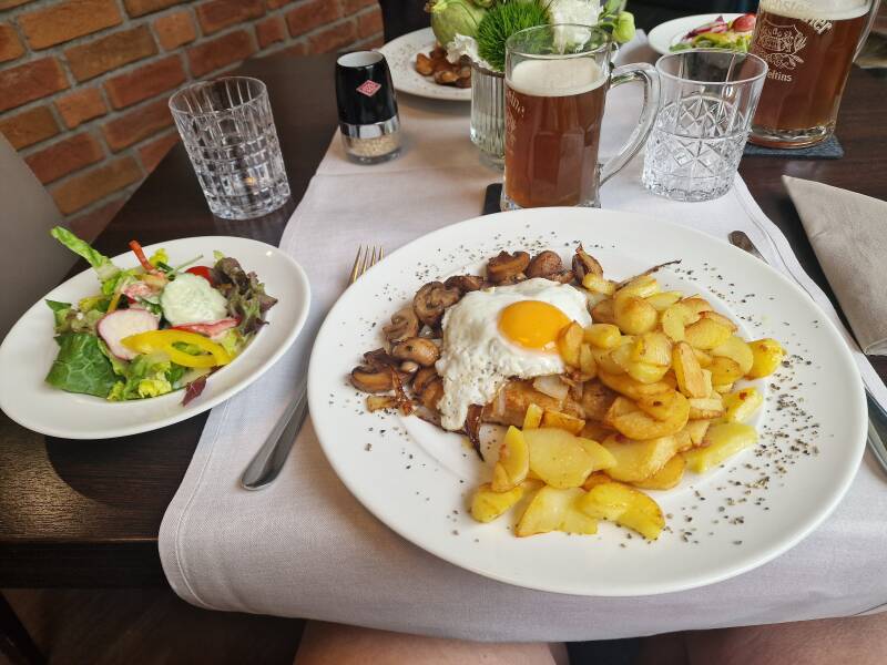 Vi spiste Yachthafenteller som var svinesnitsel (kotelet) med brasekartofler , løg , ristede champignons og spejlæg . Dertil også salat . Og så lige en mørk grevensteiner fra veltins .
